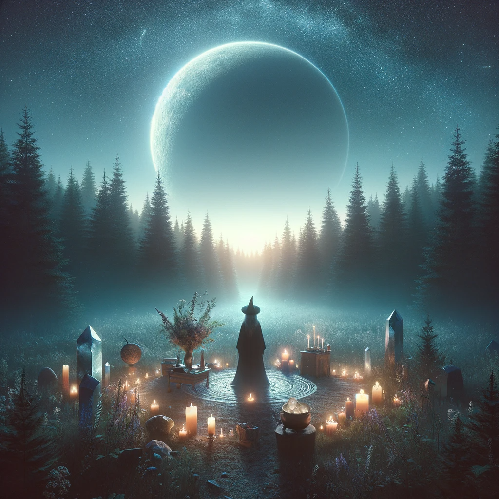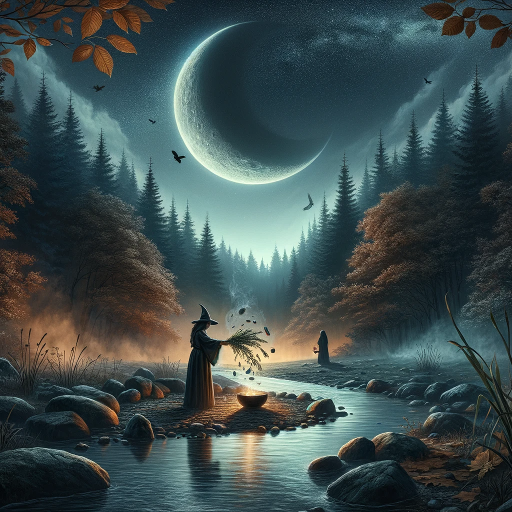 The Dark Moon, the period just before the New Moon, is often confused with the New Moon but holds its unique significance. It’s a time for rest, rejuvenation, and deep inner work. Witches may use this phase to connect with their subconscious, perform divination, and seek guidance from the spiritual realm. It’s a period of stillness and quiet, allowing for introspection and preparation before the cycle begins anew with the next New Moon.