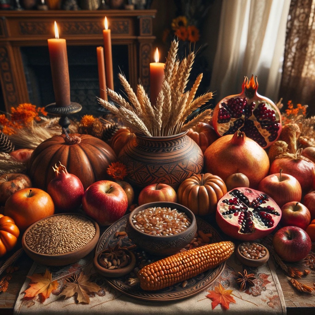 • Mabon: Apples, pomegranates, cornucopias, and grains.