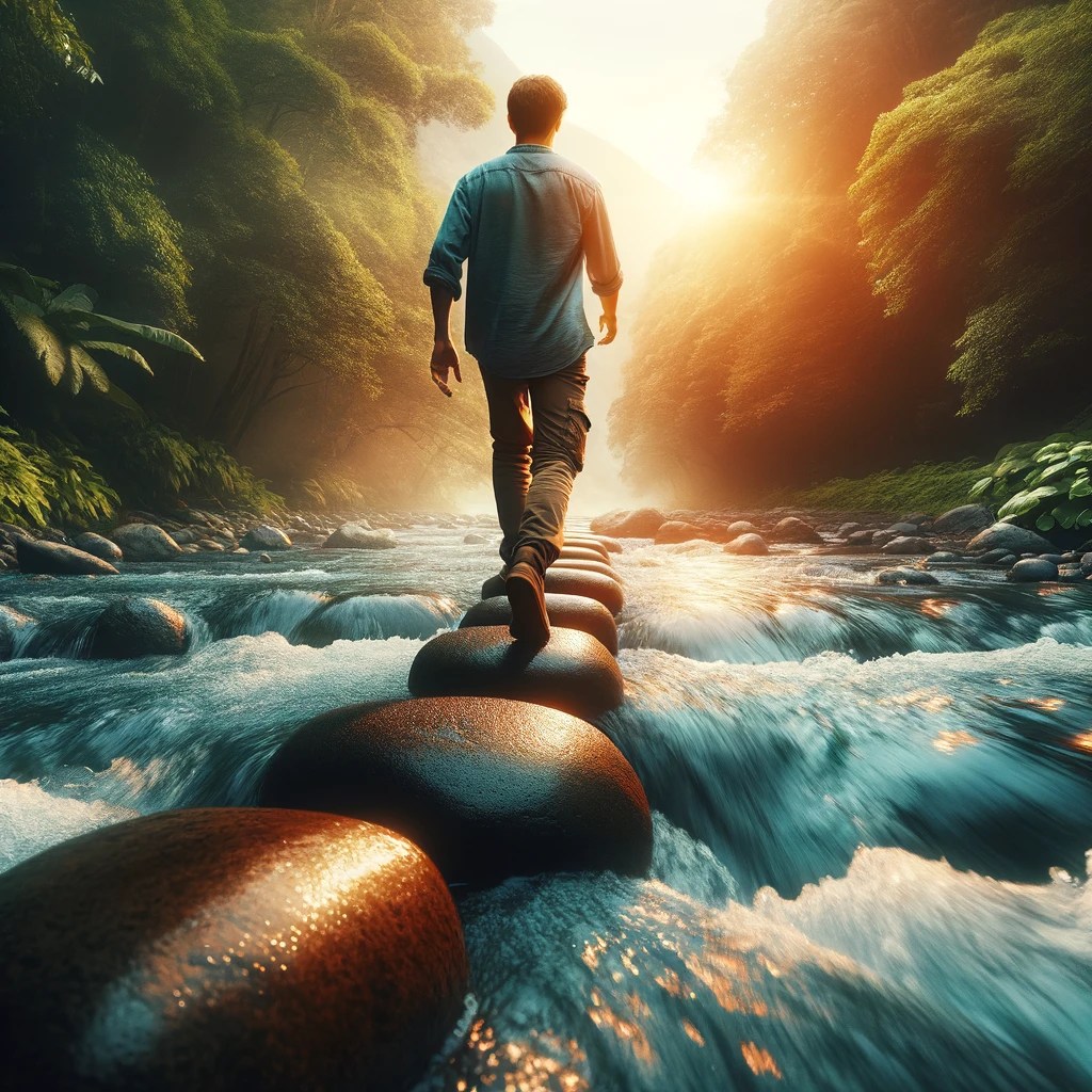Picture stepping confidently from one stone to another across a vibrant river. This act requires acceptance of the journey’s necessity and an embrace of the challenges it presents.